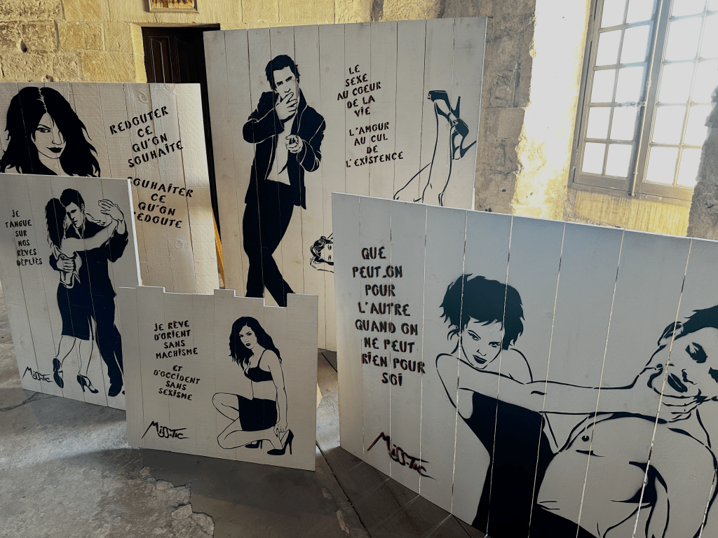 Walking through the grand halls of the Palace of the Popes, with its towering stone walls and echoes of medieval power, was an awe-inspiring experience on its own. But to see the bold, rebellious works of Miss.Tic displayed within this historic stronghold created a striking contradiction—one that felt both provocative and poetic. Her rich, vibrant stencils of fierce, enigmatic women, paired with sharp-witted phrases, stood in stark contrast to the somber weight of the palace’s past, where religious authority once reigned. The juxtaposition of her modern, defiant artistry against the rigid, centuries-old walls made the exhibition even more powerful, as if her spirit had slipped through time to challenge history itself.